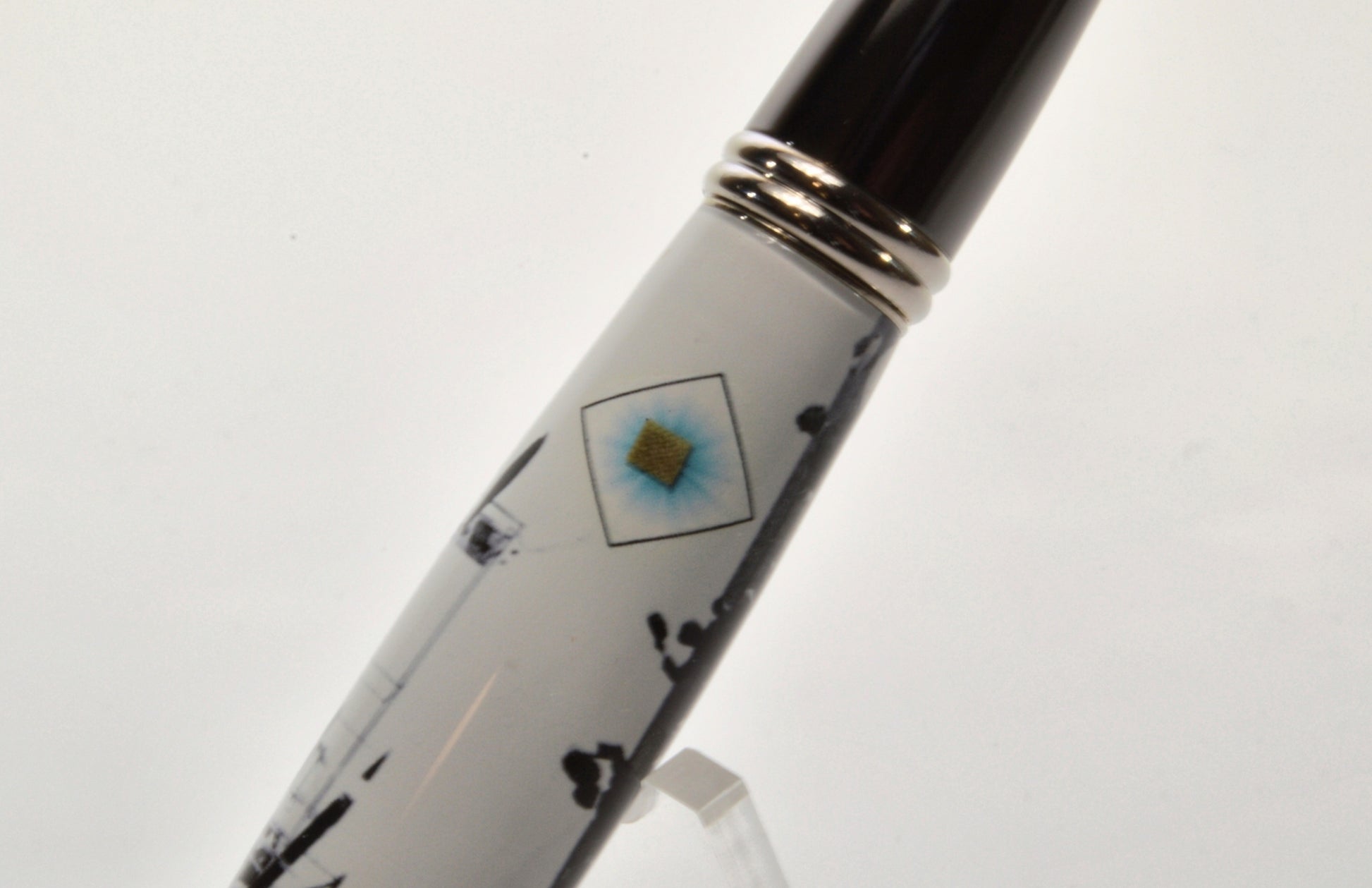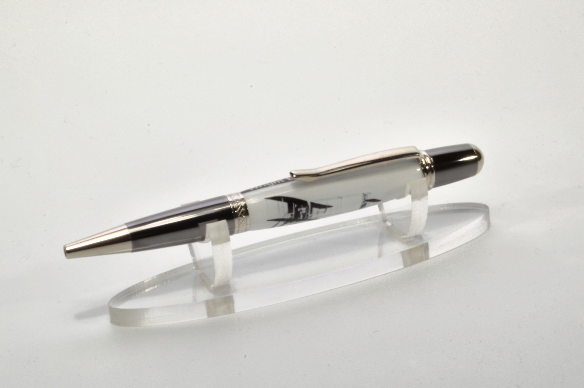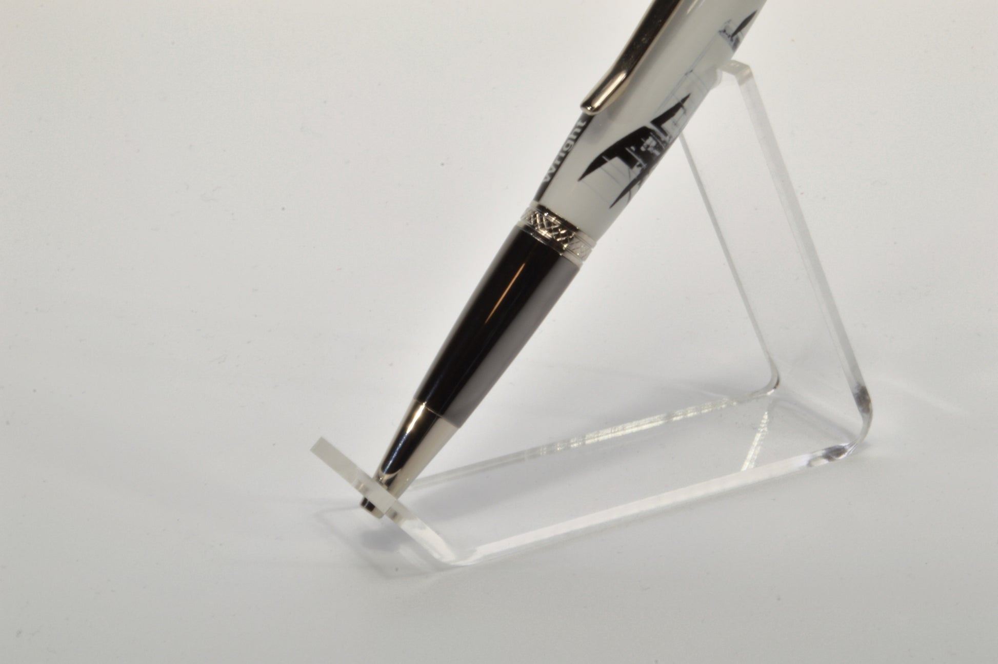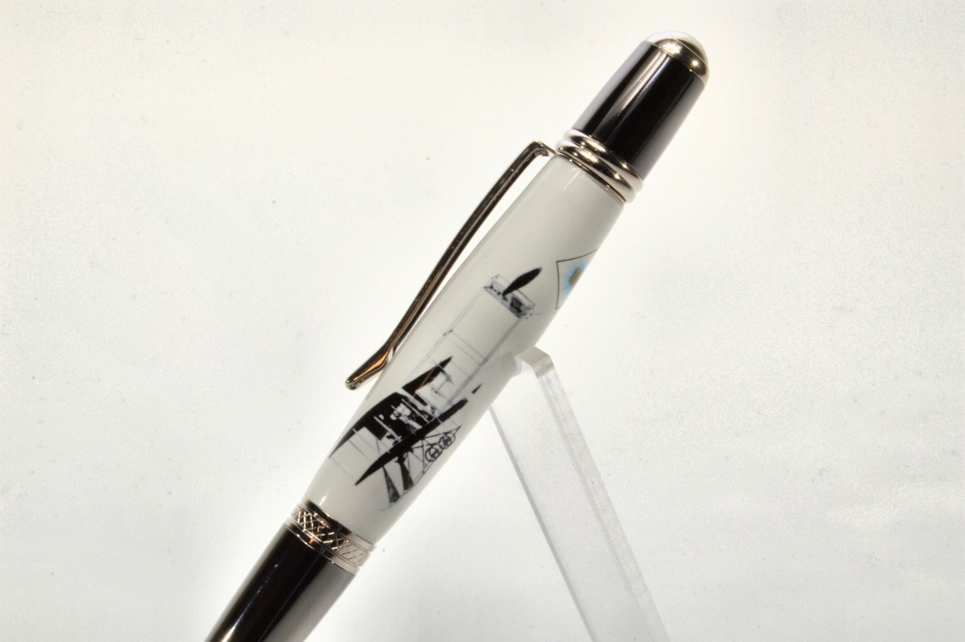 Acrylic Twist Pen Embedded with a Small Piece of Wright Brothers Vin Fiz Flyer Fabric – Platinum & Black Titanium Finish