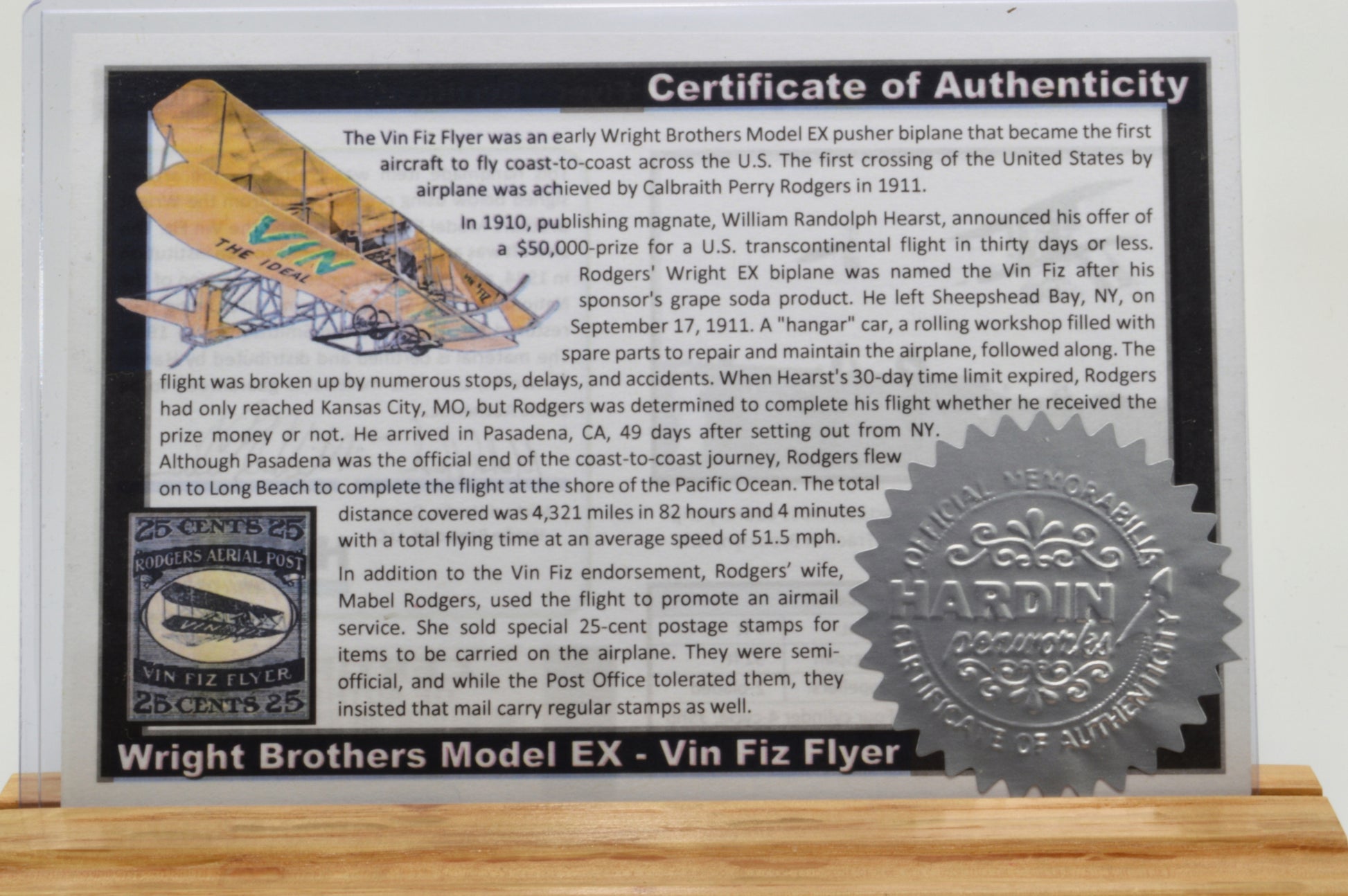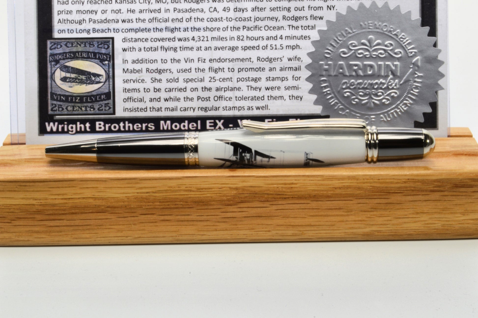 This handcrafted twist pen is made using an authenticated swatch of fabric from the Wright Brothers’ Vin Fiz Flyer, the pioneering aircraft that attempted the first transcontinental flight in 1911. The historic fabric is carefully preserved within crystal-clear acrylic, allowing the artifact to remain visible while being protected for generations. The piece of fabric is located inside the diamond shape in the body of the pen.