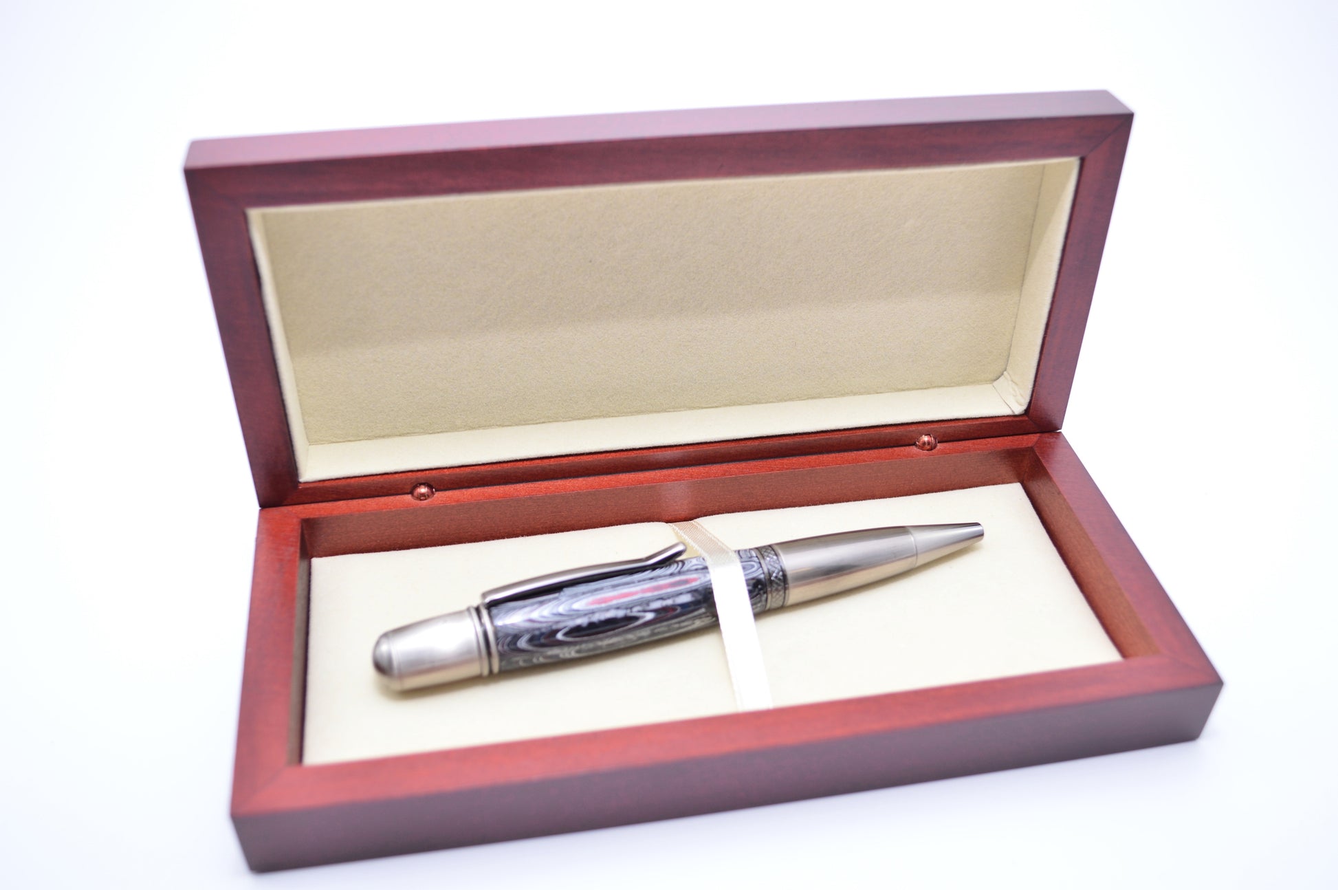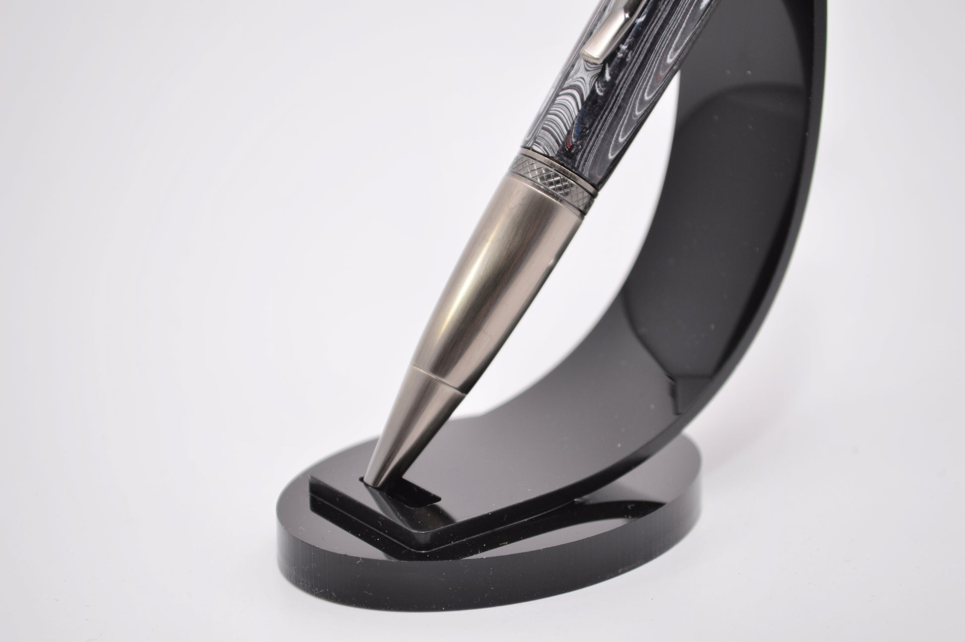 This twist pen features genuine fordite from the historic Ford plant in Wayne, Michigan. Each pen is one-of-a-kind, with vibrant color swirls and patterns created by layers of automotive paint. The gunmetal and chrome design combines craftsmanship with automotive heritage, making it a distinctive choice for car enthusiasts and art lovers alike.