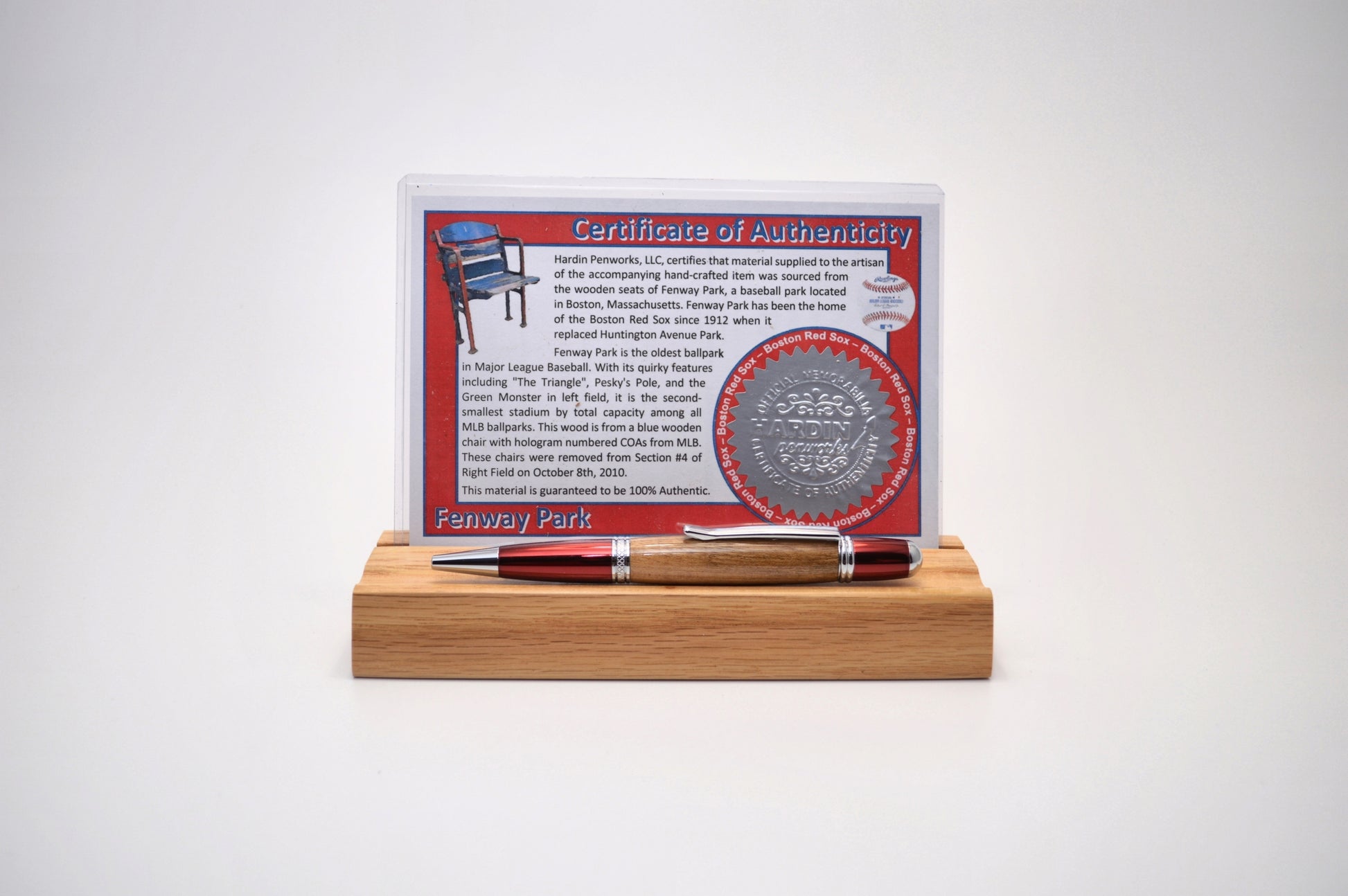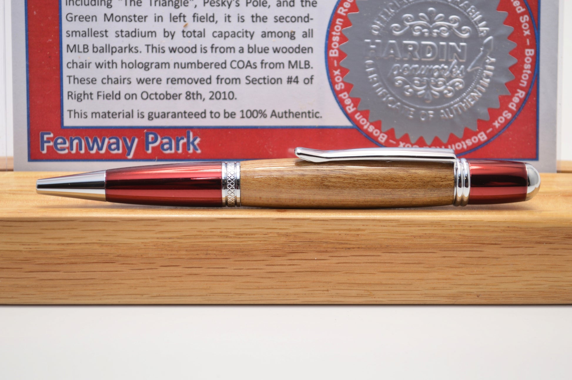 This red and chrome twist pen is handcrafted from a wooden seat from Fenway Park and comes with a Certificate of Authenticity. Fenway Park is the oldest ballfield in Major League Baseball. Fenway Park has been the home of the Boston Red Sox since 1912. The chairs were removed from section #4 of right field on October 8, 2010.