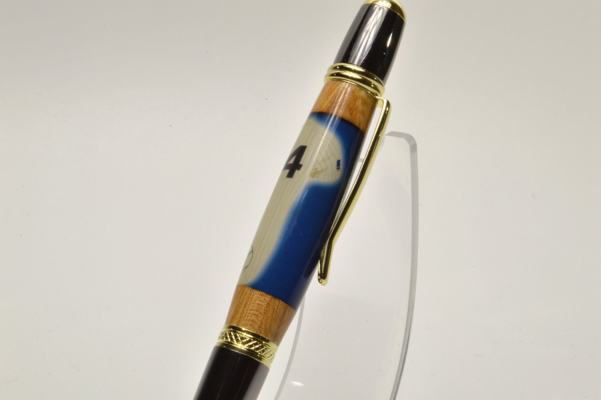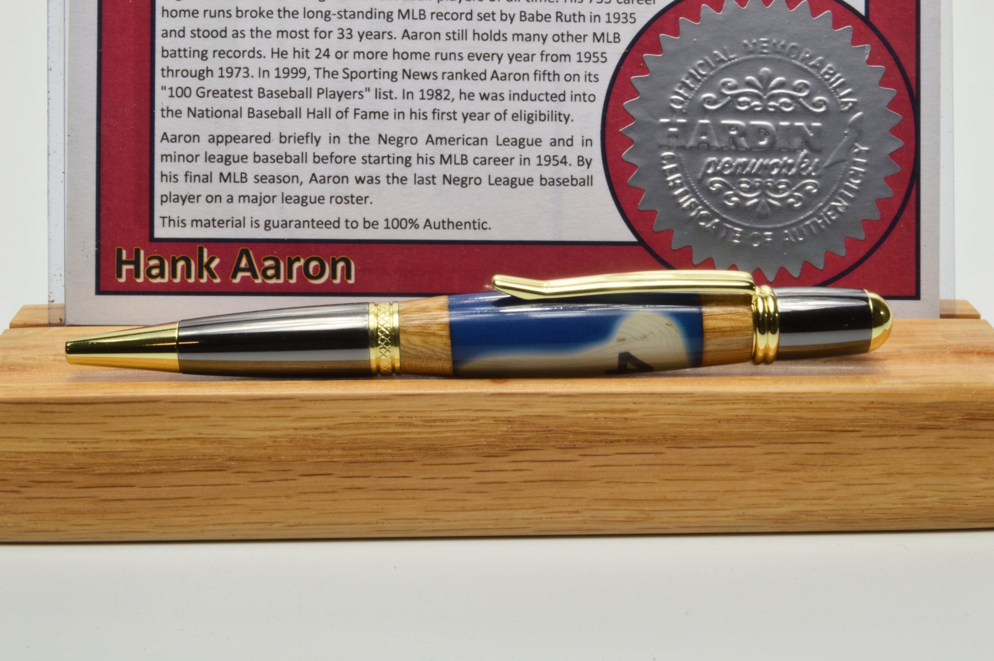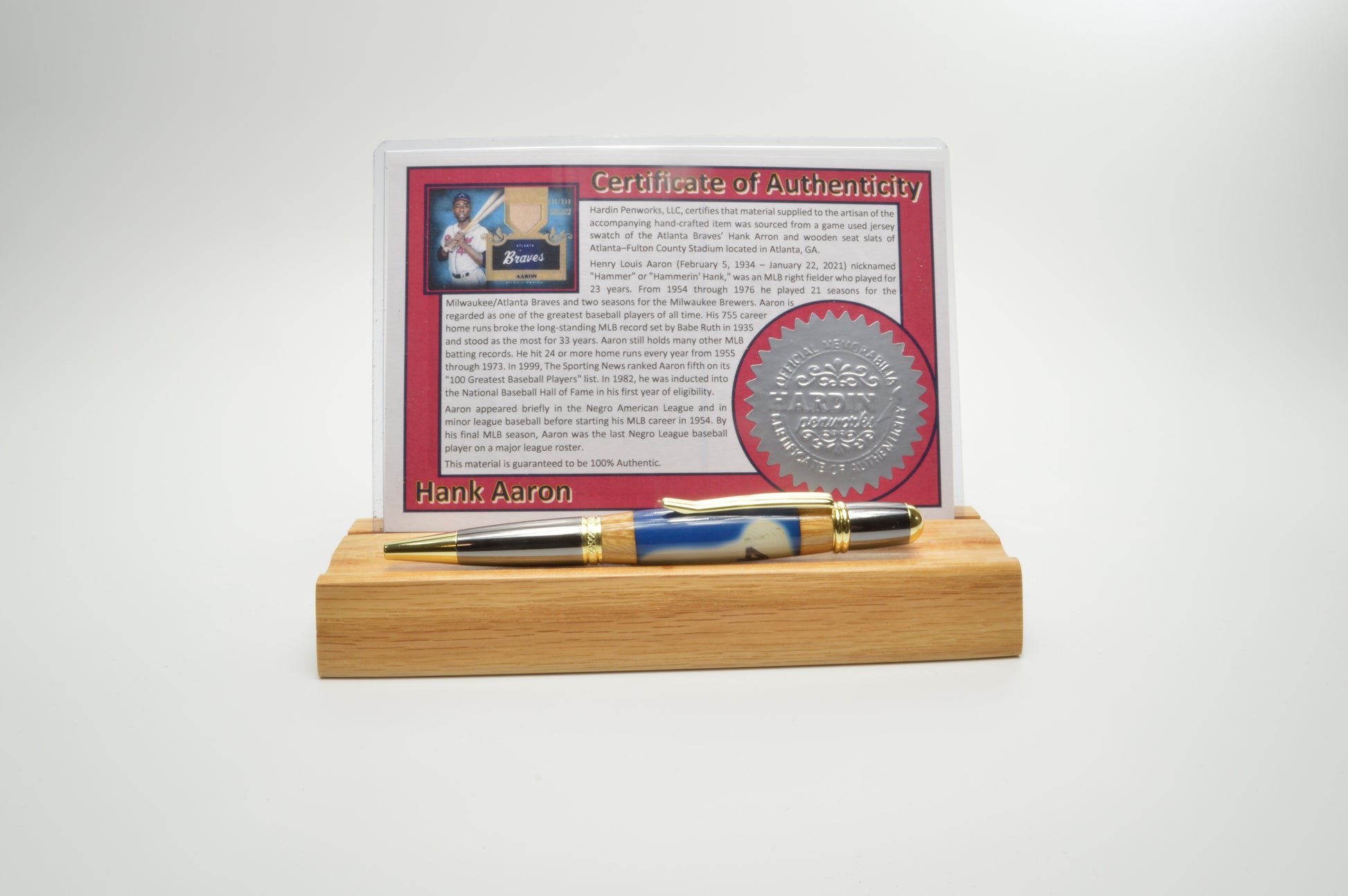 Introducing a truly unique collector's item - the Hank Aaron pen! Each pen is Gold Titanium and Black Titanium finish and is meticulously handcrafted using a swatch of a game-used jersey once worn by the baseball legend himself, paired with wood sourced from the historic Atlanta Fulton County Stadium seats and cast in clear acrylic. This one-of-a-kind writing instrument not only celebrates Hank Aaron's iconic career, but also pays homage to the memories and history of a bygone era in baseball. Own a piece of sports history with this exclusive and limited-edition Hank Aaron pen.