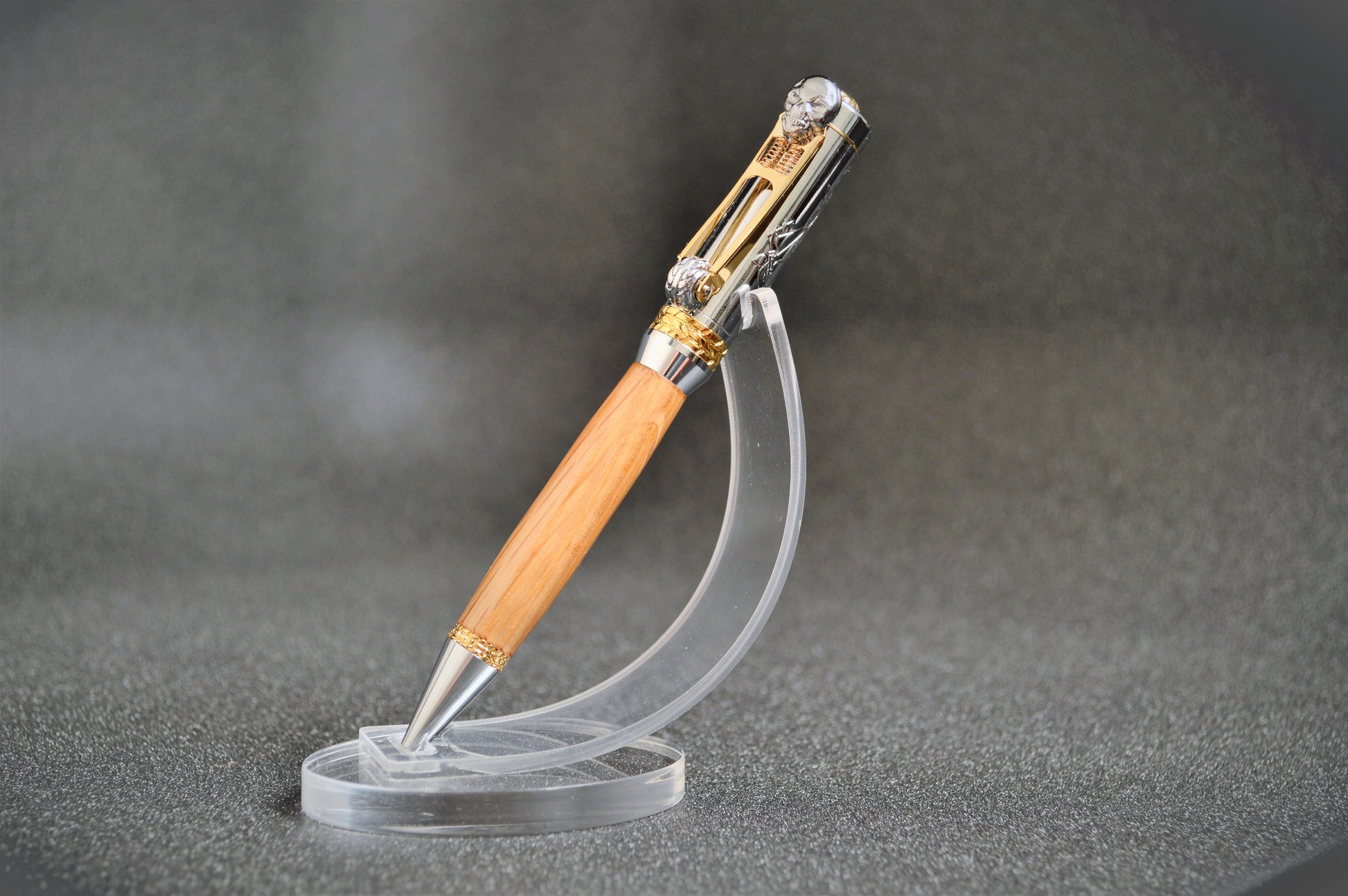 Ride with a piece of American history with this unique ballpoint pen, meticulously handcrafted using authentic white oak from a used Jack Daniel's Whiskey Barrel. The design is a tribute to the open road, featuring detailed hardware that evokes classic motorcycle styling, including a tire roller clip that is a replica of a classic Springer handlebar style front end complete with a skull headlight, etched choppers on the upper barrel, and an additional skull adorning the pen cap. This exceptional writing instrument is the perfect gift for any motorcycle enthusiast or Jack Daniel's aficionado and includes a business card-sized Certificate of Authenticity and black velvet gift pouch.