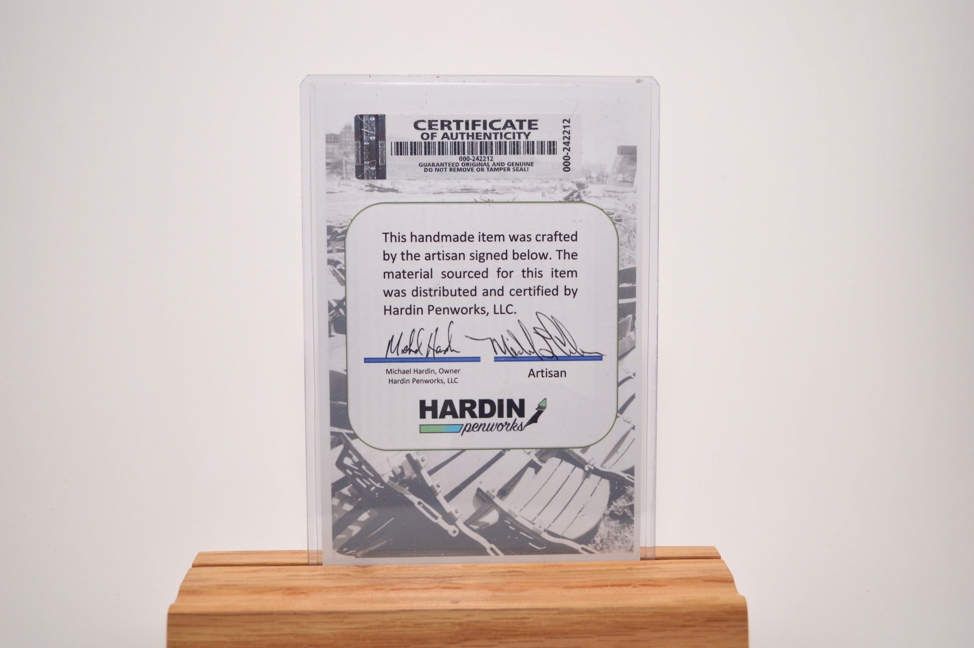Includes pen, Certificate of Authenticity, and wooden display stand.