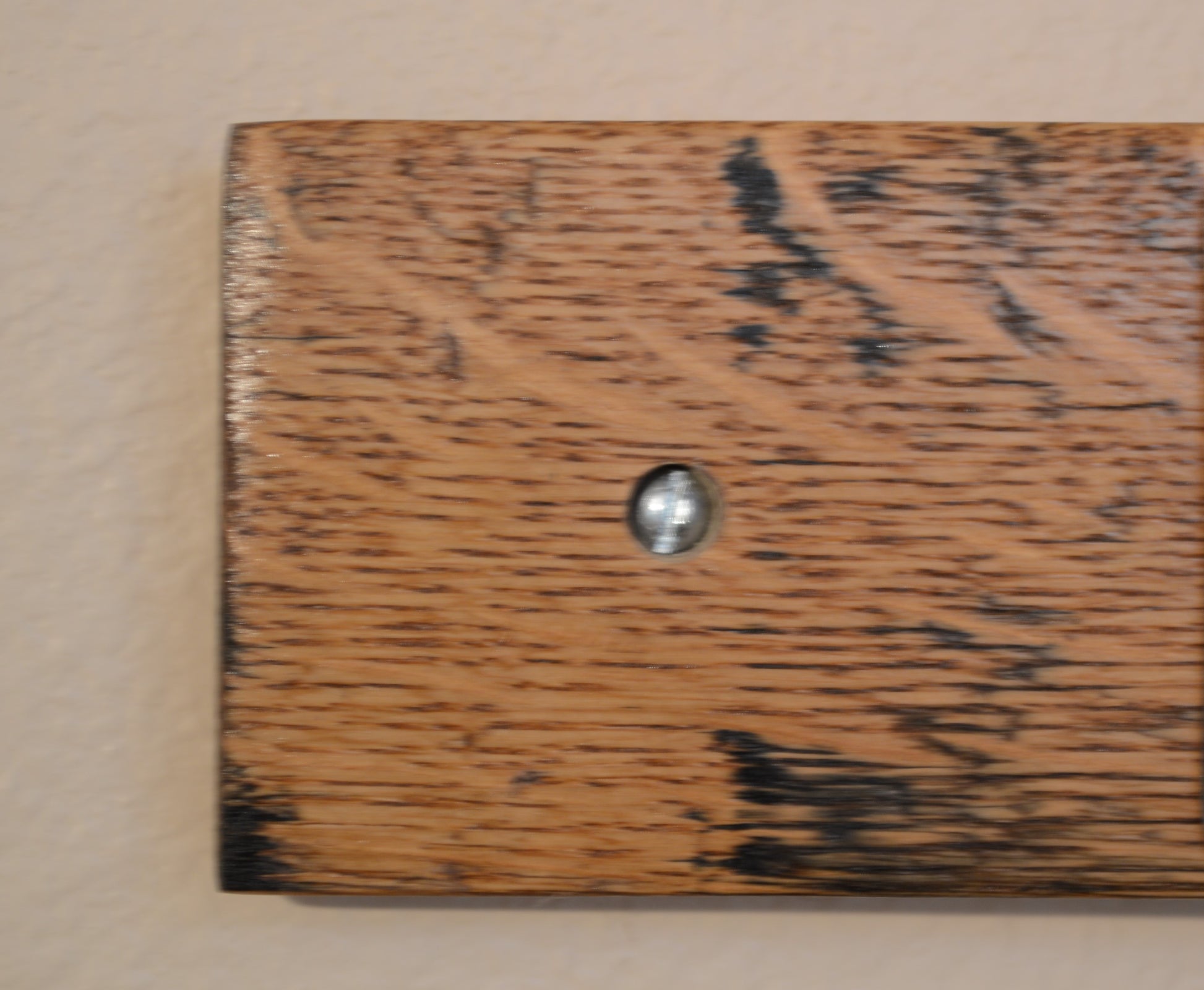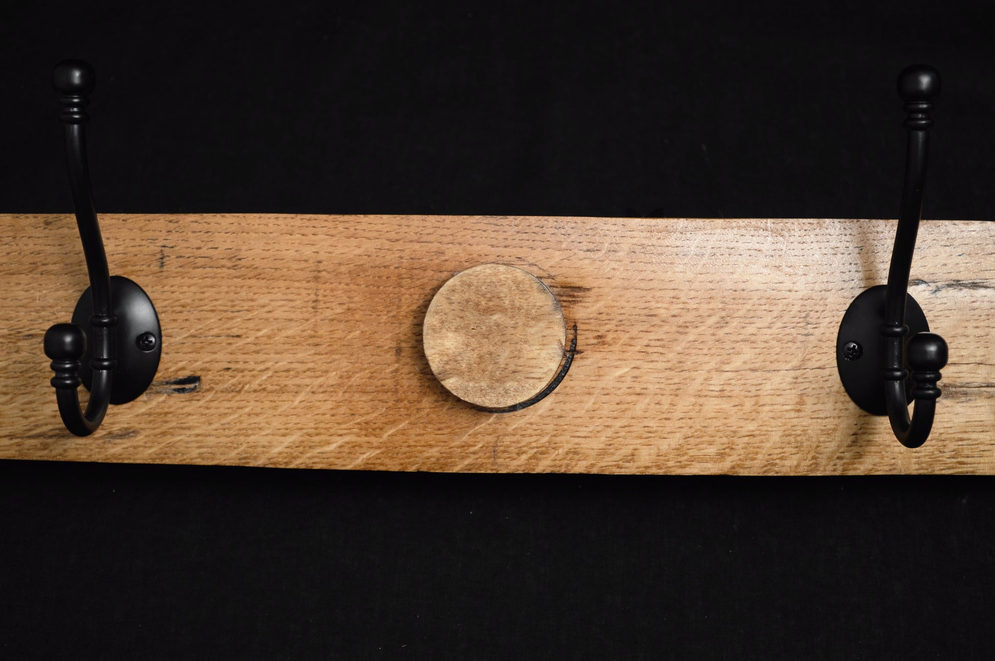 These coat racks / hat racks are made from a used whiskey barrel bung hole stave from authentic Jack Daniels charred oak whiskey barrels used for aging whiskey. The whiskey is aged in these barrels once and then the barrels are salvaged and disassembled for the staves. Pictured is a representation of the Jack Daniel's coat rack that you will receive. Each one will vary in width, depending on which size stave the cooperage drills for the bung. The coat rack is approximately 35 1/4 inches long and approximately 1 inch thick. These stave coat racks / hat racks are from a used barrel and as such may have slight imperfections and staining. Each one will have slight variations in color, stains, and imperfections with it's own distinct characteristics. It has been lightly sanded, front, back, and sides and has two coats of lacquer.